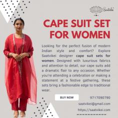Looking for the perfect fusion of modern Indian style and comfort? Explore Saatvikei designer cape suit sets for women. Designed with luxurious fabrics and attention to detail, our cape suits add a dramatic flair to any occasion. Whether you're attending a celebration or making a statement at a festive gathering, these sets bring a fashionable edge to traditional wear.