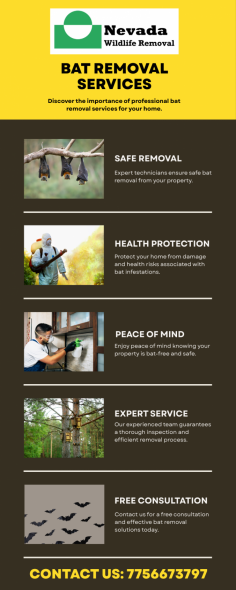 Protect your home with expert bat removal services from Nevada Wildlife Removal. Safe, humane, and effective solutions to keep bats out for good. Call at 7756673797.