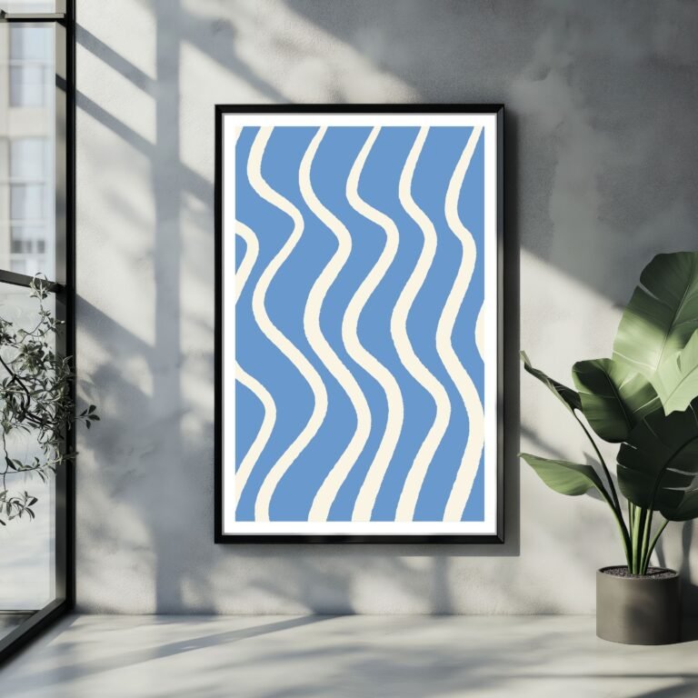 Shop this modern abstract wall art print featuring flowing wavy white lines over a soft blue background. The rhythmic wave pattern evokes a sense of movement and serenity, making it a perfect piece for living rooms, bedrooms, or offices. Printed on premium-quality paper, this minimalist artwork blends seamlessly with Scandinavian, coastal, and contemporary interiors.