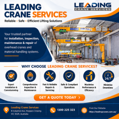 Professional overhead crane services by Leading Crane Services in Australia, offering expert installation, inspection, maintenance, and repair solutions. Ensure safe, reliable, and efficient lifting operations with certified technicians, fast servicing, and 24/7 support to minimise downtime and maximise performance.