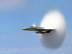 An F/A-18 Hornet emerges from a cloud caused when it broke the sound barrier