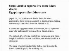 Saudi Arabia reports five more Mers deaths: Egypt reports first Mers case