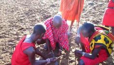 The Maasai tribesmen demonstrate how they make fire by rotating a wood stick in a hole in a board. Kenya