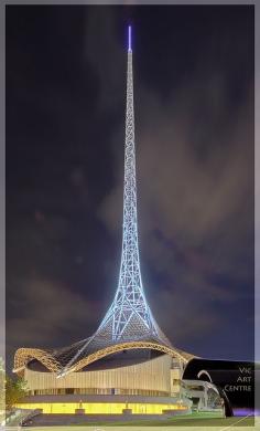 The 162-metre tall steel spire and the wrap-around base of The Victorian Arts Centre at Southgate. Designed by architect Sir Roy Grounds, the centre opened in 1982. The spire is illuminated with 6,600 metres of optic fibre tubing, 150 metres of neon