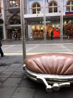 Public Purse, Bourke St Mall, Melbourne. It was commissioned in 1994 as part of an initiative by the city of Melbourne to create distinctive forms of street seating. Designed by Simon Perry, a British sculptor and academic, based in Melbourne, who is best known for his large-scale public art works for urban spaces.