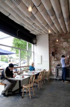 Coin Laundry Cafe Melbourne Australia, tea towels cover the ductwork.
