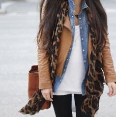 "Layers"....Leopard Print Scarf Tan/Camel Brown Leather Jacket Chambray / Denim Shirt White Shirt Black Leggings / Skinnies