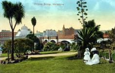 Vintage postcard - Melbourne from Southbank. Flinders St Station, Princes Bridge and St Pauls Cathedral, minus its spires.