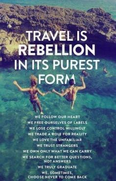 Travel is rebellion in its purest form. We follow our heart. We free ourselves of labels. We lose control willingly. We trade a role for reality. We love the unfamiliar. We trust strangers. We own only what we can carry. We search for better questions, not answers. We truly graduate. We, sometimes, chose to never come back. #TravelTuesday