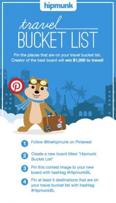 $ 1,000 Pin for your chance to win $1,000 for travel anywhere on your bucket list from Hipmunk! #HipmunkBL