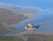 Mont Saint-Michel at low tide. The parking lot and causeway have now been removed to make it an island again.