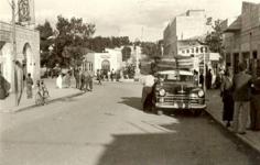 شارع ودوار المنارة، والبنك العربي. رام الله، فلسطين. ١٩٥٠. Manara Street and Square, and the Arab Bank. Ramallah, Palestine. 1950.