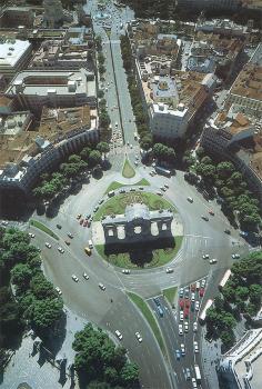 A lo largo de la Calle Alcalá. De abajo a arriba, el Parque del Retiro, su intersección con la Calle Serrano, el Palacio de Telecomunicaciones y Cibeles.