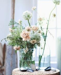 Garden or supermarket flowers in antique, washed-out tones take on a playfully unfettered feel in clear, casual vessels—and anyone can get the look.