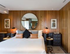 The gorgeous wood paneled walls give this hotel room a beachy feel in the SLS Hotel South beach in #Miami.