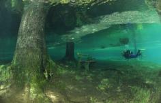 The entire park, benches and all, become submerged under the crystal-clear water from the mountains....
