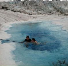 Guides last day! The true polar plunge ;). Make sure if you take the dive to put in a ice screw and cordelette or at least have a hand ready. Too slippery and sharp to get out on your own. I kept my socks on and he kept his boots on for this. That champagne ice can be unforgiving. Discovered by Sarah Kelson at Mendenhall Glacier, Juneau, Alaska