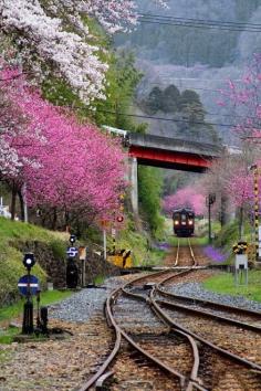 thekimonogallery: Spring in Japan: train glides/rumbles through the cherry-blossoms