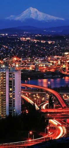 Mt. Hood, the Willamette river, and the freeway interchange viewed from the west hills of Portland, Oregon • photo: bnzai9