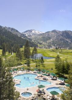 The heated hilltop pool and hot tub complex, open year-round, has 360-degree mountain views.