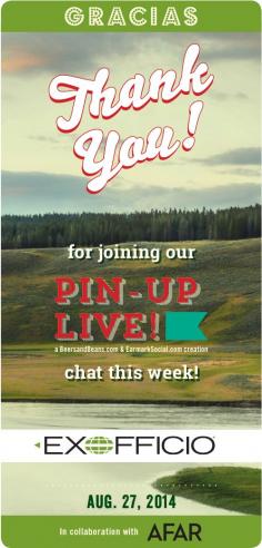 The hour goes by so fast! Thank you all so much for coming and chatting with us and ExOfficio here tonight!! We had a ton of fun and hope you did too! #PinUpLive