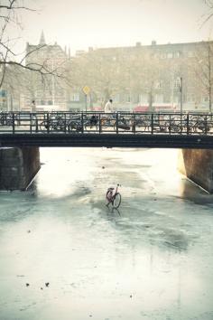 Bicycle on frozen channel, Amsterdam, The Netherlands.
