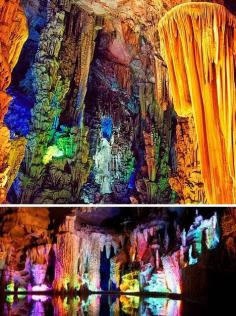 The Reed Flute Cave (China) - Outside the city of Guilin, the Reed Flute Cave is a popular travel destination while in China. The cave get’s it’s name from the reeds growing inside that are ideal for flute making. Reed Flute has a gambit of miraculous rock and mineral formations, carbon deposits, and stone pillars. The tourist attraction is illuminated by different colored lights giving it an other worldly feel.
