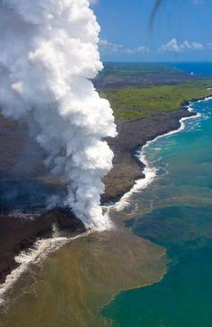 Lava flowing into the ocean with steam plume, The Big Island, Hawaii. It is amazing to see the ocean boiling like this.