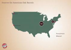 [Map] "Source of American Oak Barrels" Jan-2013 by Winefolly.com. Species used for oaking wine is American White Oak (Quecus alba). Quercus alba grows throughout the Eastern US and is commonly found in Missouri. American cooperages predominantly produce barrels for the Bourbon industry.