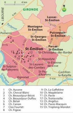 [Carte] "Carte de l'Appelation Bordeaux St Emilion Grand Cru et 15 Châteaux (France)" par Hachette-vins.com