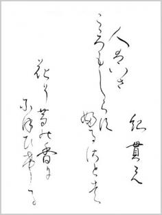 Japanese poem by Kino Tsurayuki from Ogura 100 poems (early 13th century) 人はいさ 心も知らず ふるさとは 花ぞ昔の 香ににほひける "The village of my youth is gone, / New faces meet my gaze / But still the blossoms at thy gate / Whose perfume scents the ways / Recall my childhood's days." (calligraphy by yopiko)