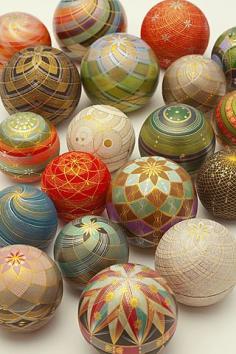 Kirikane decorated balls by National Living Treasure of Japan as a Kirikane artist, Sayoko ERI (1945~2007) まり香盒 人間国宝・江里佐代子 (A kirikane is a decorative technique used for Buddhist statues and paintings, using gold leaf, silver leaf, platinum leaf cut into lines, diamonds and triangles.)