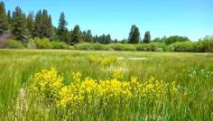 A beautiful meadow in South lake Tahoe. Flowers, waving grass, a family of ducks swimming in the pond and edged with tall, stately Redwoods.