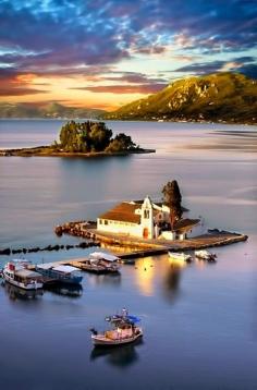 Pontikonisi at sunset, Corfu Island, Greece.