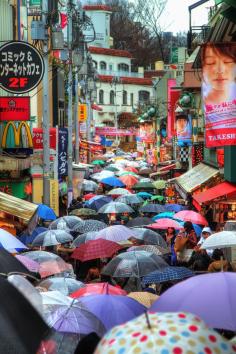 Wonderful, colorful photo of umbrellas on a narrow street in Tokyo