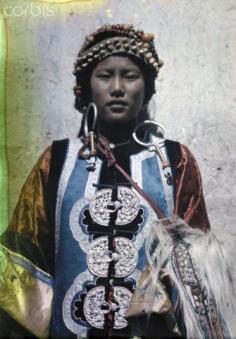 China | A young Yongning woman poses in large earrings and embroidered robe. Yunnan Province. ca. July 1931 | © Dr. Joseph F. Rock/National Geographic Society/Corbis