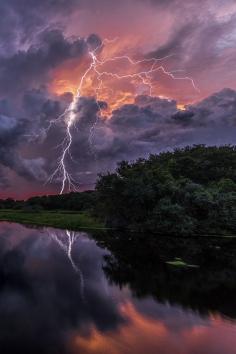 Myakka Electrical Sunset by Justin Battles | #lightning #sunset #clouds #reflection