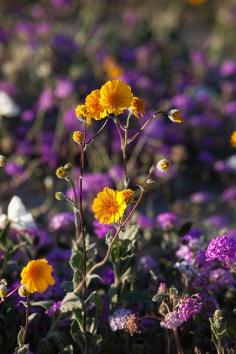 Desert sunflower with sand verbena (purple), spectacle pod (white) and dune evening primrose (large white) in the background. Seen in Anza Borrego State Park.