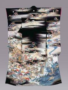 Furisode kimono by National Treasure of Japan as Yuzen dyeing artist, UENO Tameji (1901-1960) 黒縮緬地近江八景文様振袖 上野為二