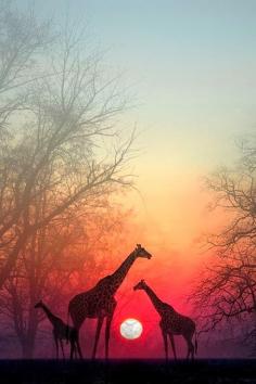 Giraffes in the Sunset, Masai Mara National Park, Kenya, Africa.