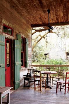 Step Inside the Ultimate Bayou Cottage | DomaineHome.com // Southern front porch with wooden chairs and green barn doors.