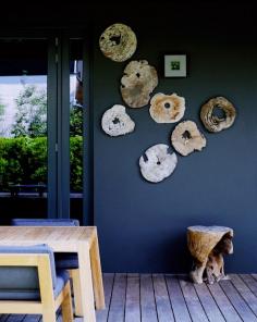 Patio space with wood slab slices hung on a blue wall.