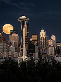 breathtakingdestinations: Full Moon at the Space Needle in Seattle, Washington - USA