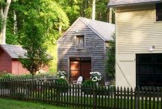 Wooden country farmhouse, surrounded by gorgeous greenery.