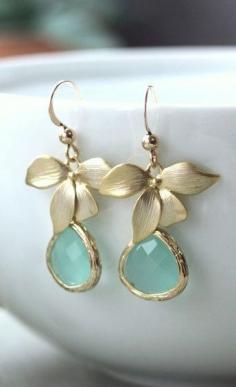 Gold Filled. A Matte Gold Orchid Flower Mint Opal Glass Framed Jewel Gold Filled Earrings