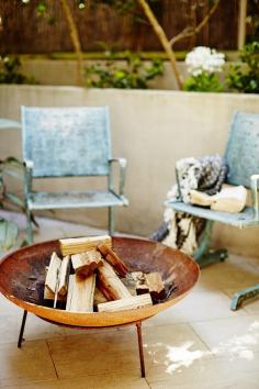 Firepit with weathered chairs.