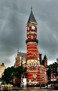 Jefferson Market Courthouse, originally built as the Third Judicial District Courthouse in 1874, had an adjacent women's jail (now torn down and replaced with a garden).
