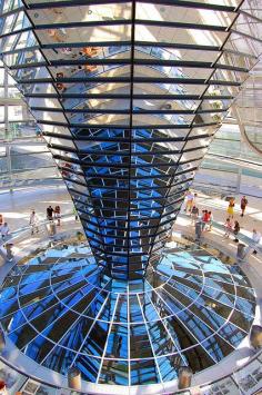 Norman Foster, "Reichstag Dome", 1999, a glass dome constructed on top of the rebuilt Reichstag building, symbolizing the reunification of Germany. A mirrored cone in the center of the dome directs sunlight into the building, so that visitors can see the working of the chamber, Berlin, Germany.