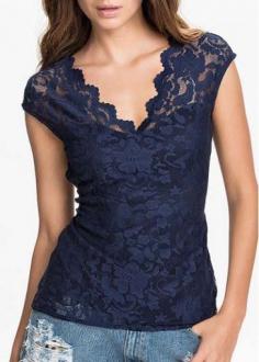 Enchanting Cap Sleeve V Neck Blue T Shirt