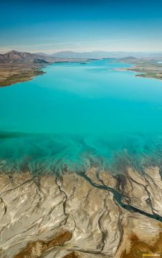 From the air Lake Tekapo appears extra terrestrial in form. A vibrant shade of aquamarine the water looks as though artificially dyed..